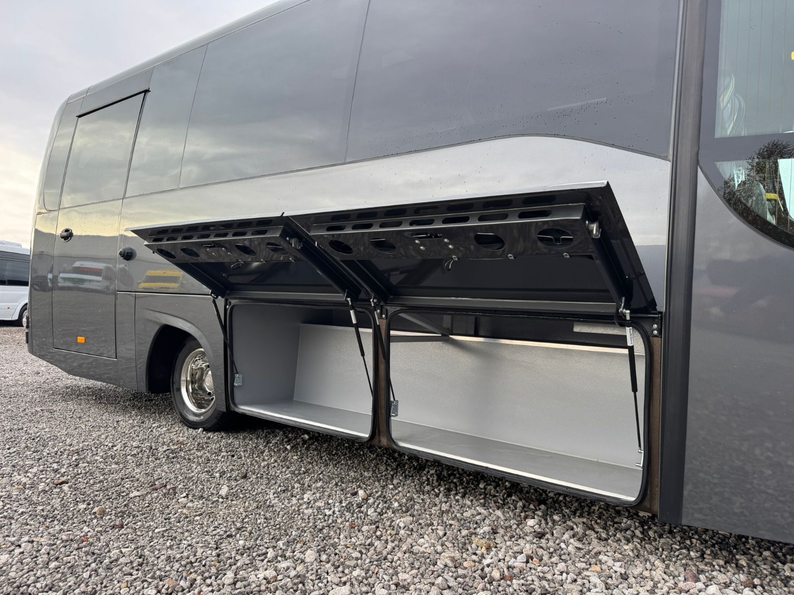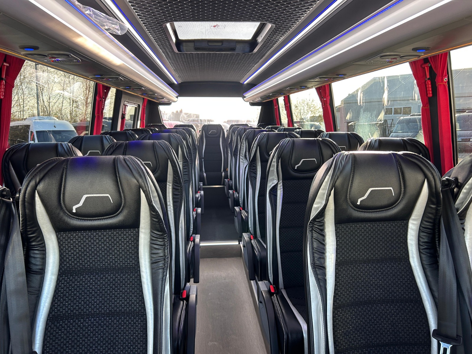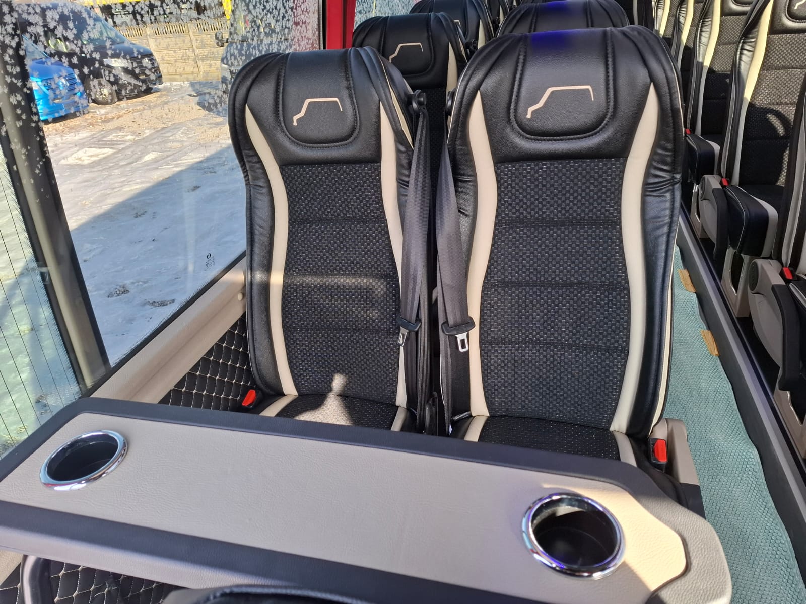 Semileather reclining seats; panorama windows; 2xAC; Fridge; TFT monitor & playback from card or flash disc; WIFI.